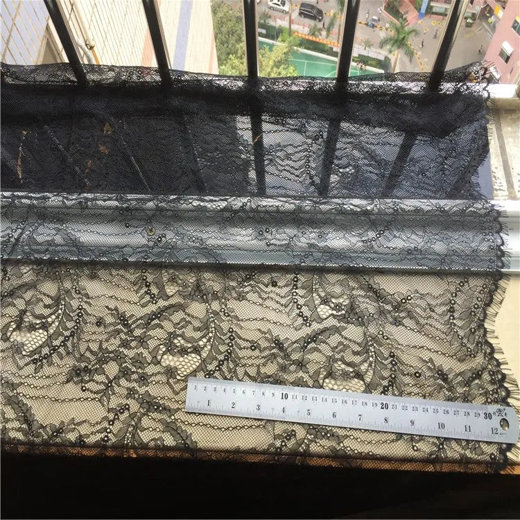 Eyelash lace fabric features delicate scalloped edges with fine thread detailing, making it ideal for bridal dresses, lingerie, evening wear, and feminine fashion designs.