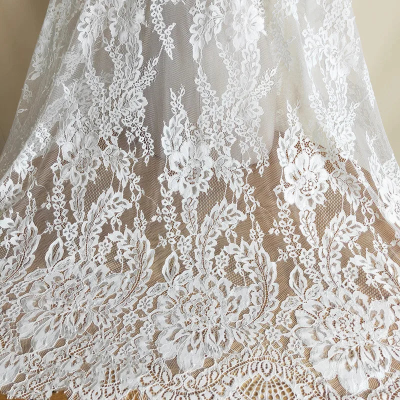 Eyelash lace fabric features delicate scalloped edges with fine thread detailing, making it ideal for bridal dresses, lingerie, evening wear, and feminine fashion designs.