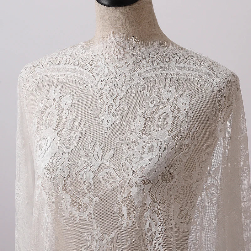 Eyelash lace fabric features delicate scalloped edges with fine thread detailing, making it ideal for bridal dresses, lingerie, evening wear, and feminine fashion designs.
