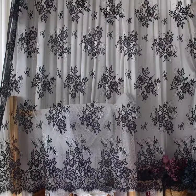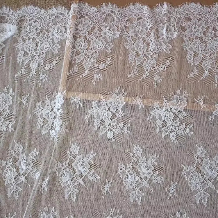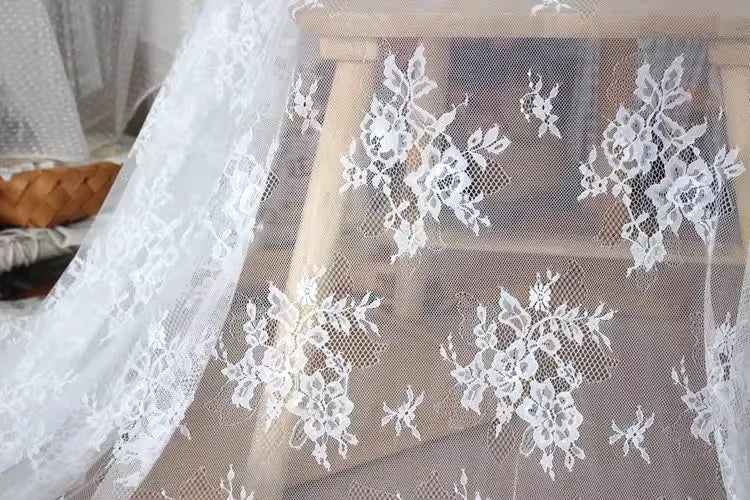 Eyelash lace fabric features delicate scalloped edges with fine thread detailing, making it ideal for bridal dresses, lingerie, evening wear, and feminine fashion designs.