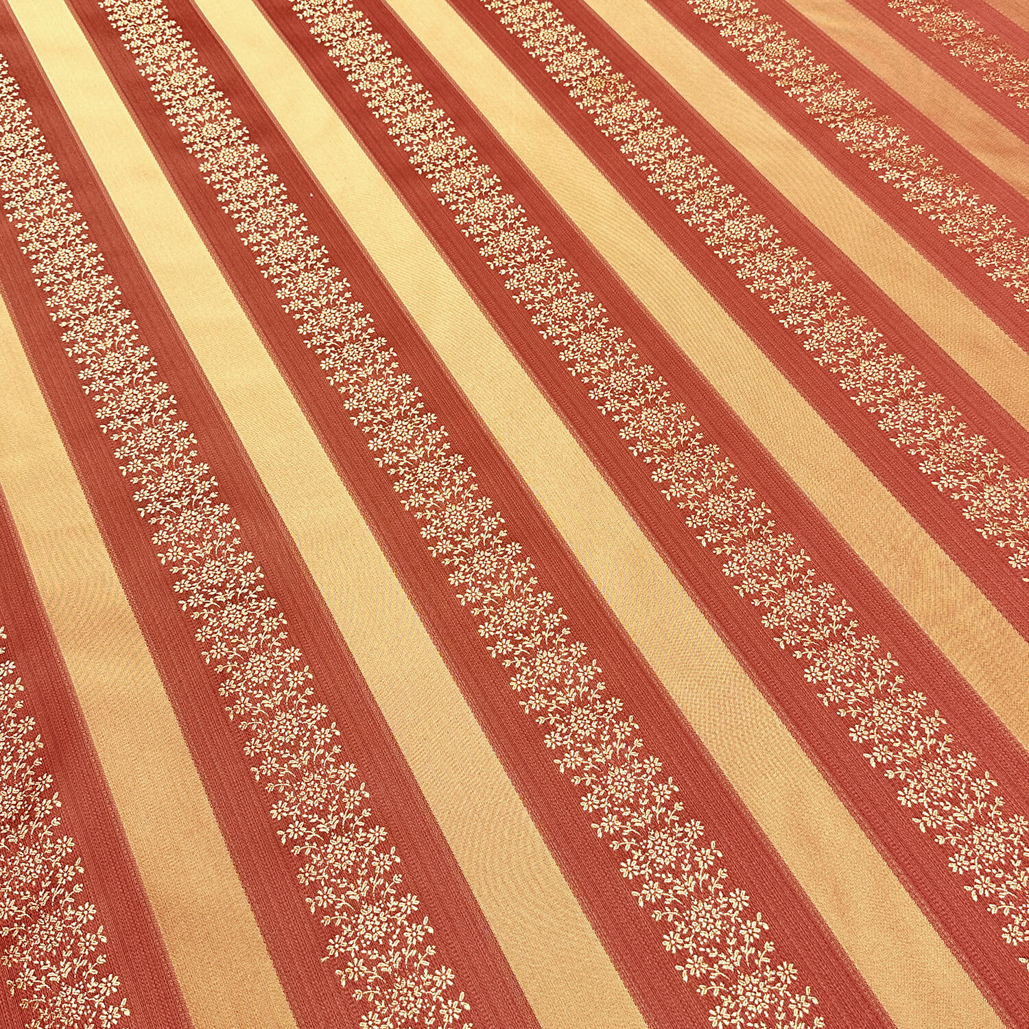 This luxurious striped jacquard brocade fabric with a gold floral design along wide stripes is a medium-weight cotton mixed material for making drapes, curtains, sofas, ottomans, duvet covers, bedding, bedspreads, upholstery, pillows, tablecloths and even traditional costumes.