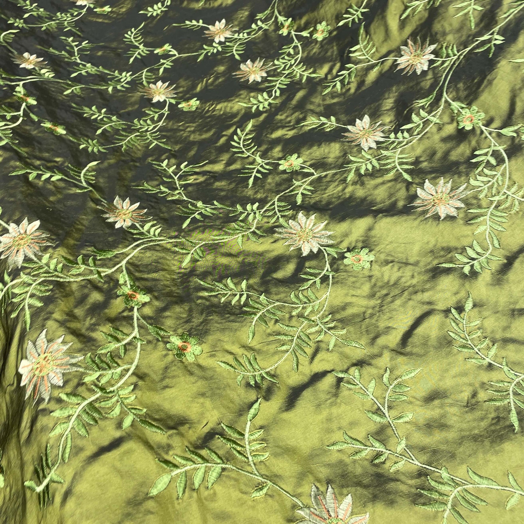 Tessuto di seta finto taffetà con ricamo floreale verde scuro